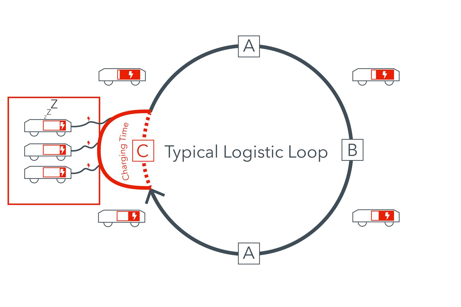 Since the energy level of the vehicles remains constantly high due to the short stops, only a small capacity range of the batteries is required. The required capacity of the battery used is reduced by up to 30 % and thus also the costs for the acquisition of AGVs and AMR.